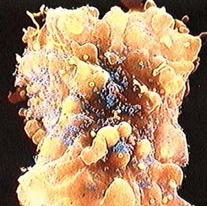 Fig. 5 - Electronic microscopy of a cell surrounded by a small particles.